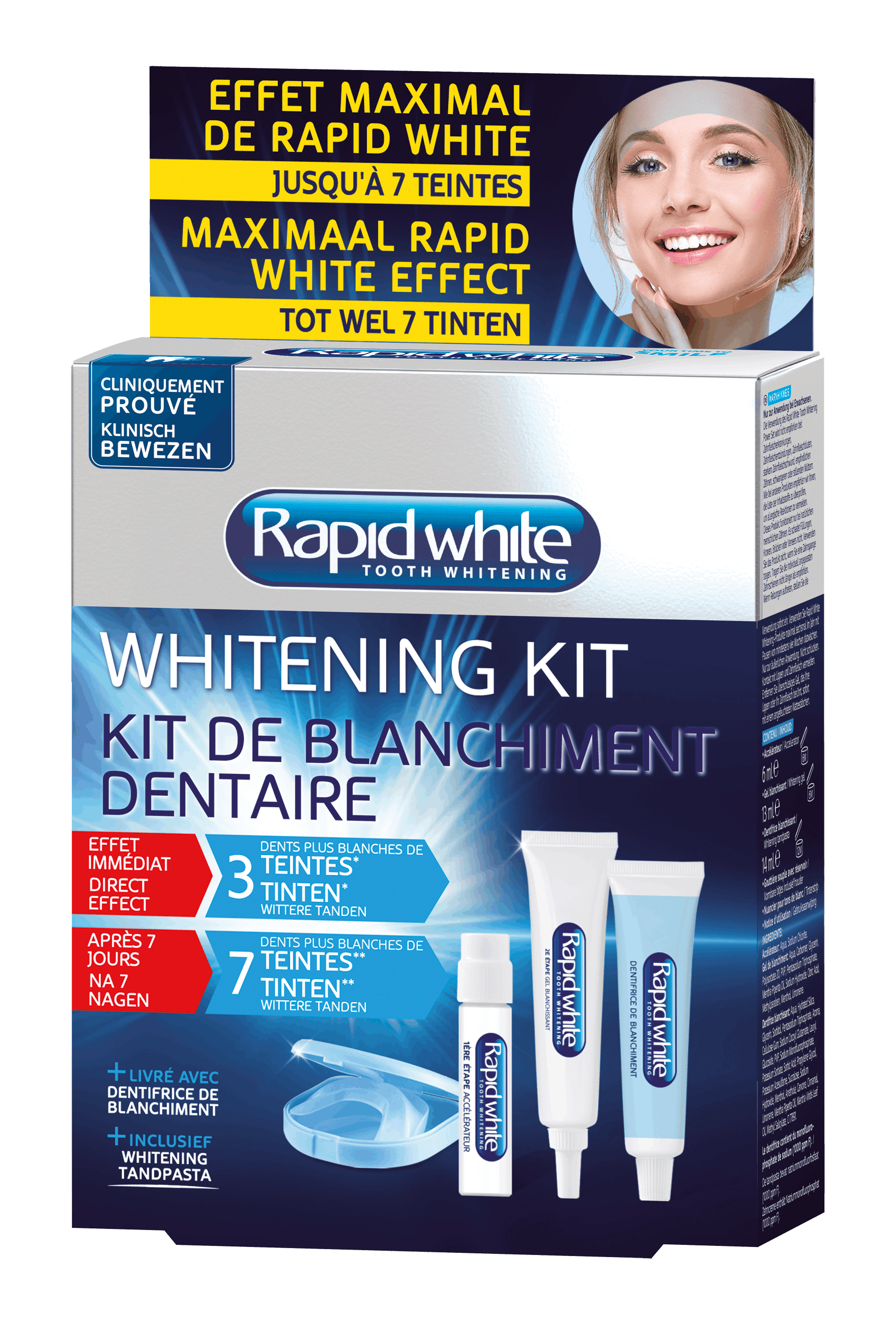 De Whitening Kit geeft je tot 7 tinten wittere tanden in slechts 1 week*. Deze set bevat ook Rapid White Instant Whitening Tandpasta die de tanden reinigt, beschermt en tot wel 3 tinten witter maakt in slechts 1 keer gebruik**, en daarnaast ook fluoride bevat om het tandglazuur te versterken en opnieuw te mineraliseren.
